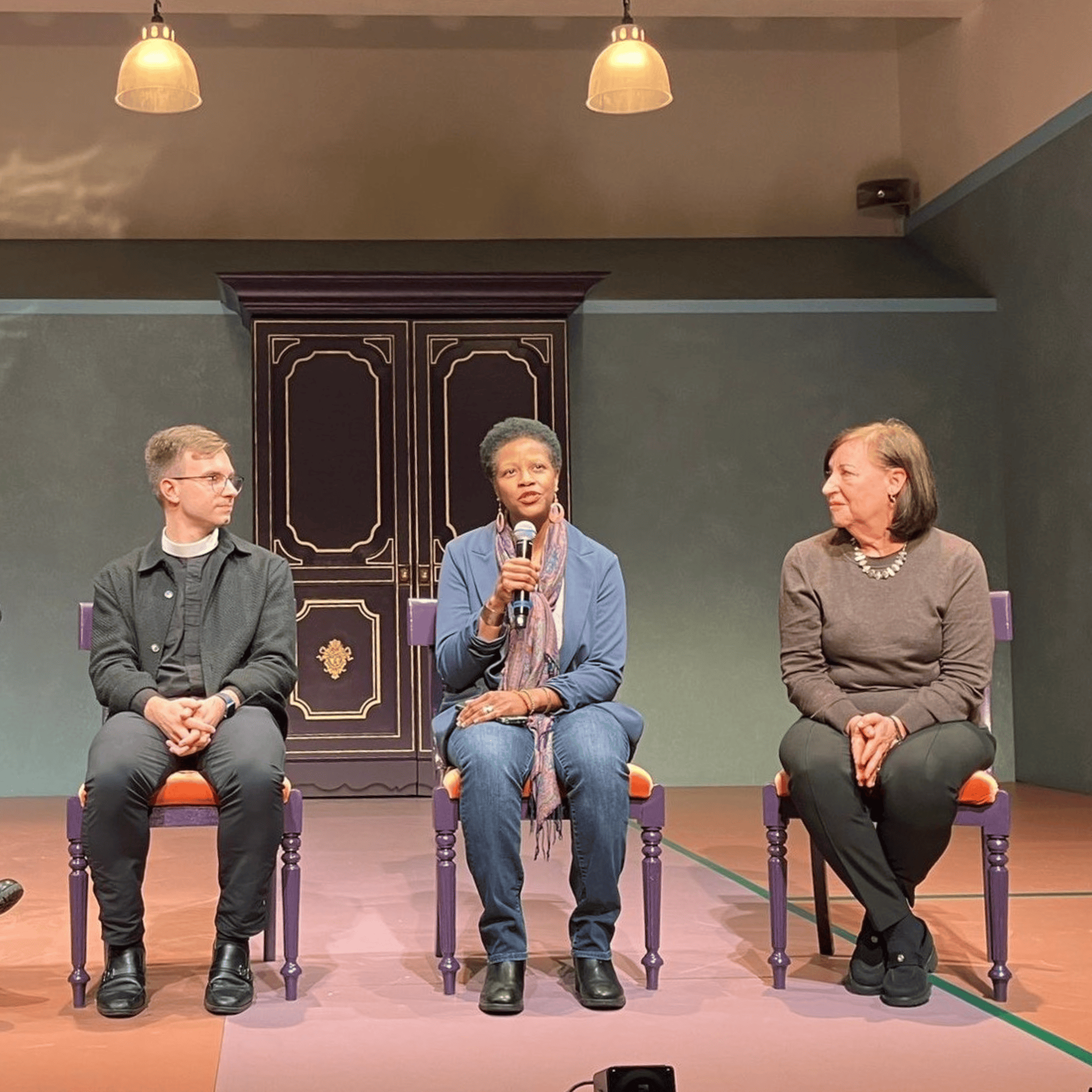 From left to right, Father Andrew Ancona (St. Luke in the Fields), Iya Rev. DeShannon Barnes-Bowens (ILERA), and Rabbi Kim Geringer (Hebrew Union College) speak during the Dec 2nd AfterWords.