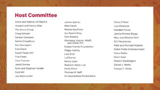 The Host Committee includes Vienn and Salman Al-Rashid; Howard and Nancy Alter; The Araca Group; Craig Balsam; Damon Cardasis; Sarita Choudhury; Ken Davenport; Eisa Davis; Susan Fales-Hill; Five Fates; Dale Franzen; Jared Grimes; Ruth and Stephen Hendel; Dulé Hill; Jon Michael Hill; James Ijames; Mike Karns; Moisés Kaufman; Aja Naomi King; Tom Kirdahy; Kleinberg, Kaplan, Wolff, and Cohen P.C.; Kodjoe Family Foundation; Peggy Koenig; Lisa Kron; LaChanze; Kenny Leon; Madison Wells Live; Emily Mann; Thomas M. Neff; No Guarantees Productions; Denis O’Hare; Lisa Peterson; Wendell Pierce; Jamila Ponton Bragg; Miyo and Mitchell Reff; RCI Theatricals; Patti and Michael Roberts; Rohm Feifer Entertainment; Fiona Rudin; Kevin Ryan; Sharon Washington; Daniel J. Watts; George C. Wolfe.